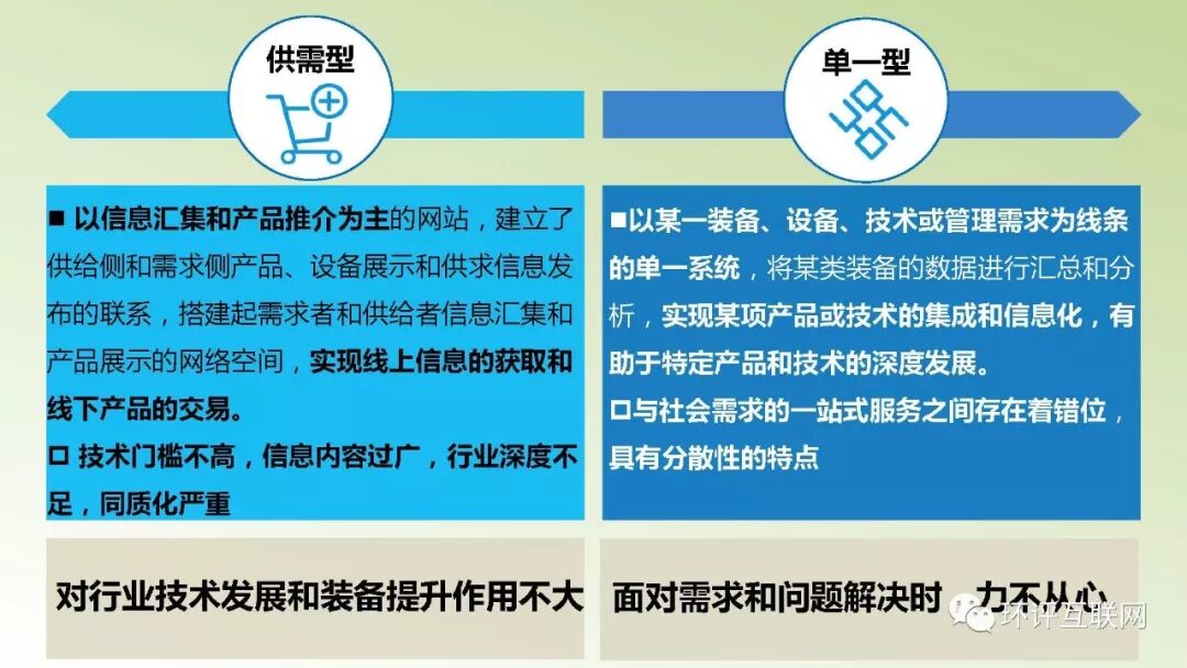 前者存在技术门槛不高,信息内容过广,行业深度不足,同质化严重等问题,后者与社会需求的一站式服务之间存在着错位,无法满足解决综合环境问题的需要。