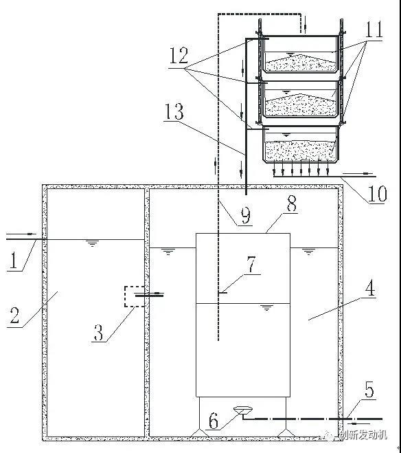 进水管1,粪渣池2,管道式格栅3,生化池4,曝气管5,曝气器6,进气管7,曝气罩8,升液管9,出水管10,泥饼过滤器11,溢流管12,回流管13
