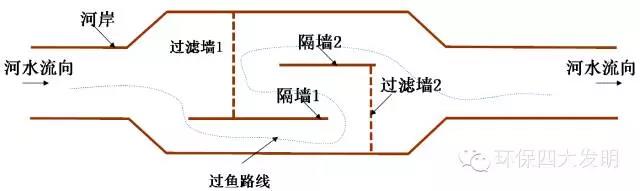 如图5所示,在河道上建设隔墙一2和隔墙二4两组隔墙,建设过滤墙一3和过滤墙二5两组过滤墙,形成沉淀池区并留出过鱼线路6,河水经沉淀和过滤净化后流向下游河道,固态污染物被拦截在沉淀区去除,鱼类等水生动物通过过鱼线路6进入下游河道或洄游到上游。