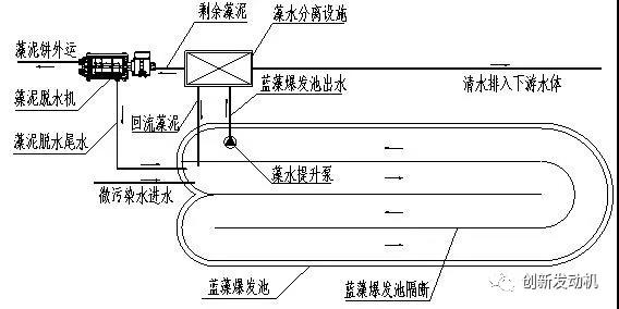 如图6所示,蓝藻爆发池主要包括蓝藻爆发池2、藻水提升泵4、藻水分离设施6和藻泥脱水机9。来水进入蓝藻爆发池2,由蓝藻富集水体中的氮、磷等营养元素,通过藻水提升泵4将蓝藻爆发池2内藻水提升至藻水分离设施6,分离出的清水流向下游水体,藻泥一部分回流至蓝藻爆发池2,一部分经藻泥脱水机脱水后泥饼外运。