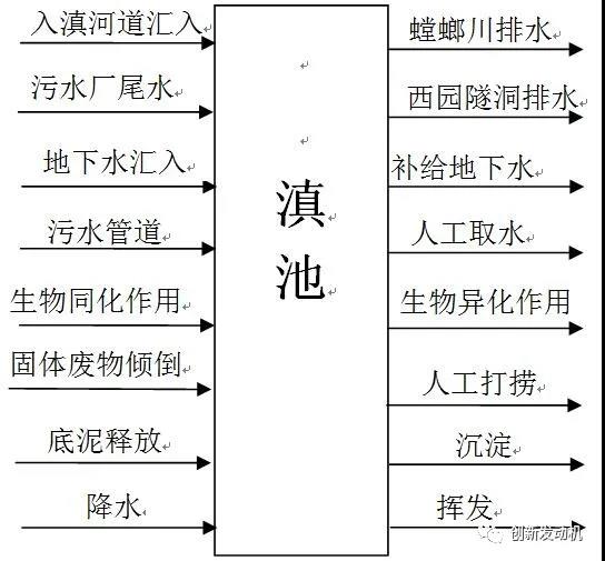 如果不考虑生态用水量的增减,滇池的污染是一个污染物的输入与输出的动态平衡问题。当输入滇池的污染物总量大于输出滇池的污染物的总量时,污染物就会在水体内累积,水质就会恶化,反之则水质改善。如果不考虑污染物量的增减,生态用水的量越多水质越好,反之越差。因此从总体上看,滇池治理的过程就是减少污染物的输入量、增加污染物的输出量、增加生态用水量的过程。滇池污染物主要流向如图1所示: